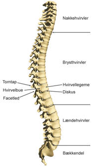 Rygsøjlen består af 24 hvirvler. Den omslutter og beskytter rygmarven. Rygsøjlen stabiliserer kroppen og overfører vægt til bækkenet og benene.